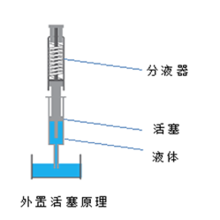 分液器結(jié)合分液管,采用外置活塞原理。分液管內(nèi)自帶有活塞,通過活塞的連接運動移取和打出液體(類似注射器)。