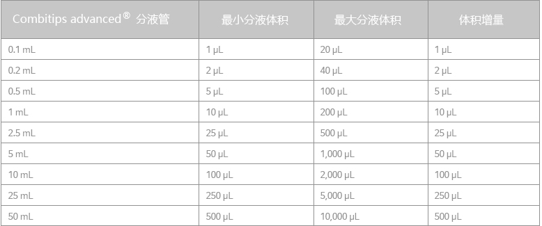 分液器可分裝的體積由所選擇的分液管體積所決定,如下表