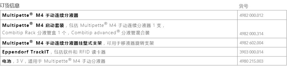 訂貨號(hào):4982000314 Multipette? M4 手動(dòng)連續(xù)分液器結(jié)合9種不同規(guī)格 Combitips advanced? 分液管,提供從 1 μL——10 mL 的分液范圍,一次吸液可完成最高 100 次分液。特別適合于高粘度、易起泡、易揮發(fā)、危險(xiǎn)性等問題液體的移取及分裝。