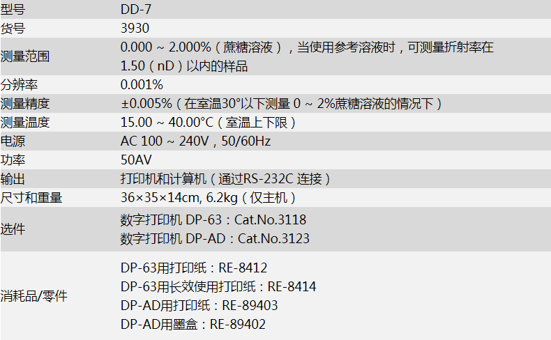 | 測量精度 | ±0.005%(在室溫30°以下測量0~2%蔗糖溶液的情況下) |