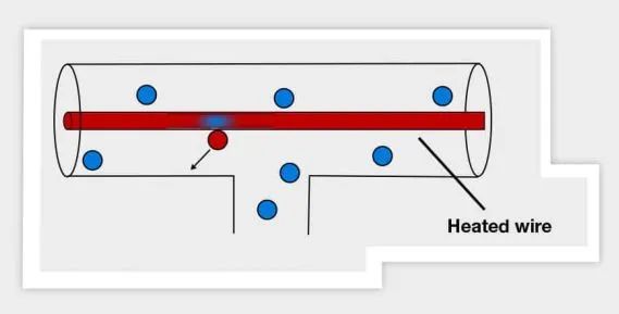 該技術(shù)使用兩種不同的壓力計(jì),一個(gè)皮拉尼傳感器和一個(gè)電容壓力計(jì)。皮拉尼傳感器的工作原理是氣體的熱導(dǎo)率隨壓力變化。壓力計(jì)用一根細(xì)導(dǎo)線懸掛在氣體中,用電流加熱來(lái)測(cè)量壓力。在高壓下,由于周圍氣體分子與金屬絲的高碰撞率,金屬絲將熱能損失給氣體。這一原理如下圖所示。