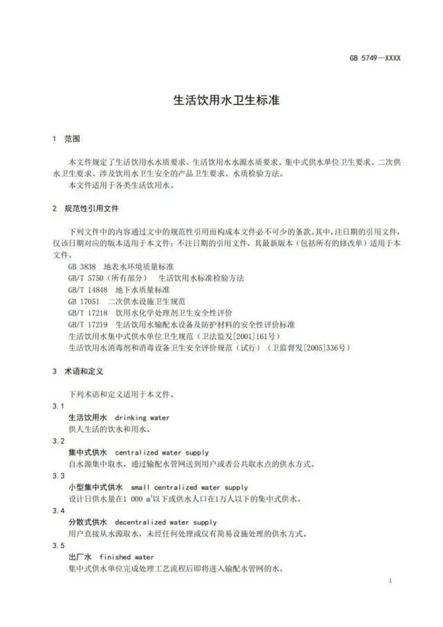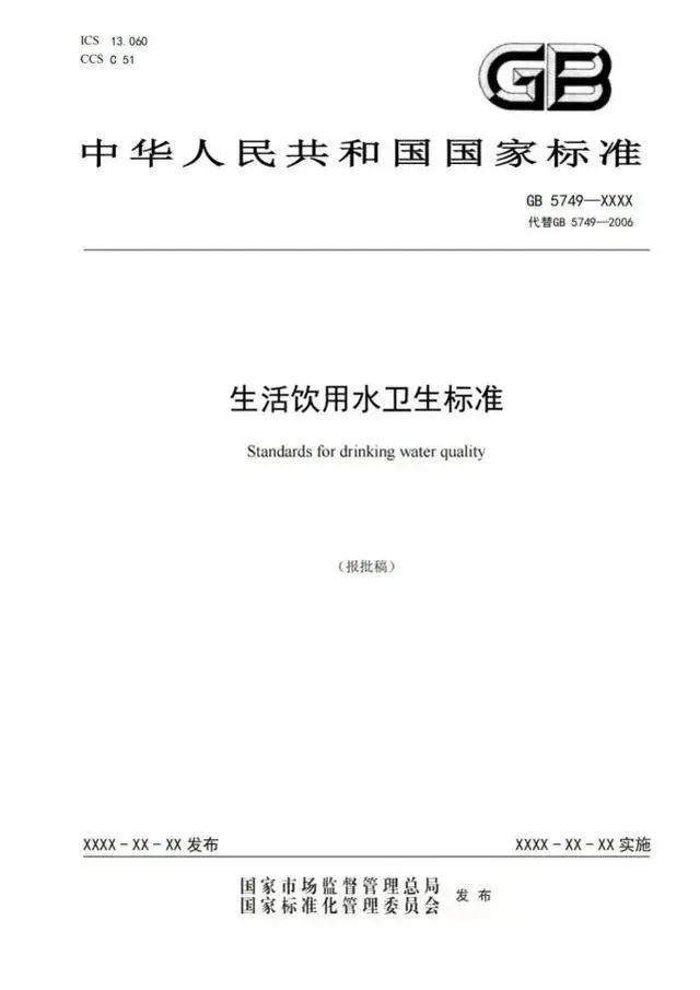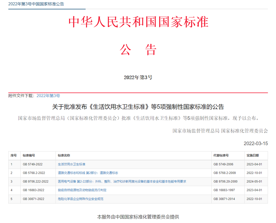 2022年3月15日,國(guó)家市場(chǎng)監(jiān)督管理總局(國(guó)家標(biāo)準(zhǔn)化管理委員會(huì))批準(zhǔn)《生活飲用水衛(wèi)生標(biāo)準(zhǔn)》等5項(xiàng)強(qiáng)制性國(guó)家標(biāo)準(zhǔn)。