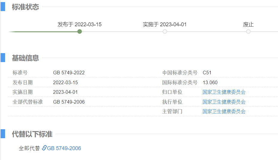 其中《生活飲用水衛(wèi)生標(biāo)準(zhǔn)》(GB 5749-2022)由國(guó)家衛(wèi)生健康委員會(huì)歸口上報(bào)及執(zhí)行,主管部門為國(guó)家衛(wèi)生健康委員會(huì),將全部代替現(xiàn)行的 GB5749-2006,于 2023年4月1日 開(kāi)始實(shí)施。目前,全國(guó)標(biāo)準(zhǔn)信息公共服務(wù)平臺(tái)暫未正式發(fā)布標(biāo)準(zhǔn)全文,預(yù)計(jì)于4月上旬公布(發(fā)布后20個(gè)工作日內(nèi))。