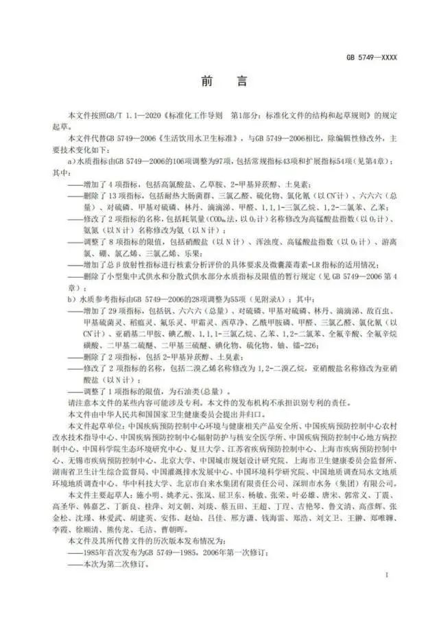 而 GB 5749-2022 標(biāo)準(zhǔn)的起草單位在原有中國(guó)疾病預(yù)防控制中心環(huán)境與健康相關(guān)產(chǎn)品安全所的基礎(chǔ)上新增了18加專業(yè)單位,這也就意味著標(biāo)準(zhǔn)內(nèi)容的制定更加全面、更加嚴(yán)格、更加權(quán)威。